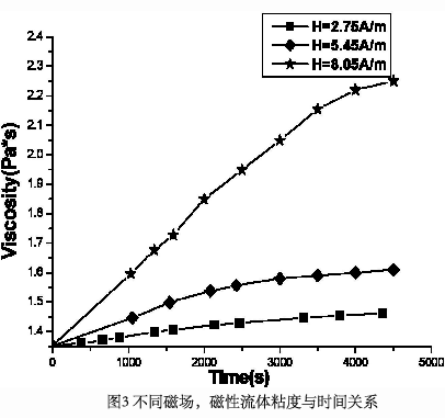 者之间的摩擦力增加,导致磁性流体粘度的增加。但是,随着时间的进一步推移,磁性流体基载液和磁性微粒之间旋转速度逐渐趋于稳定,这样磁性流体的粘度逐渐